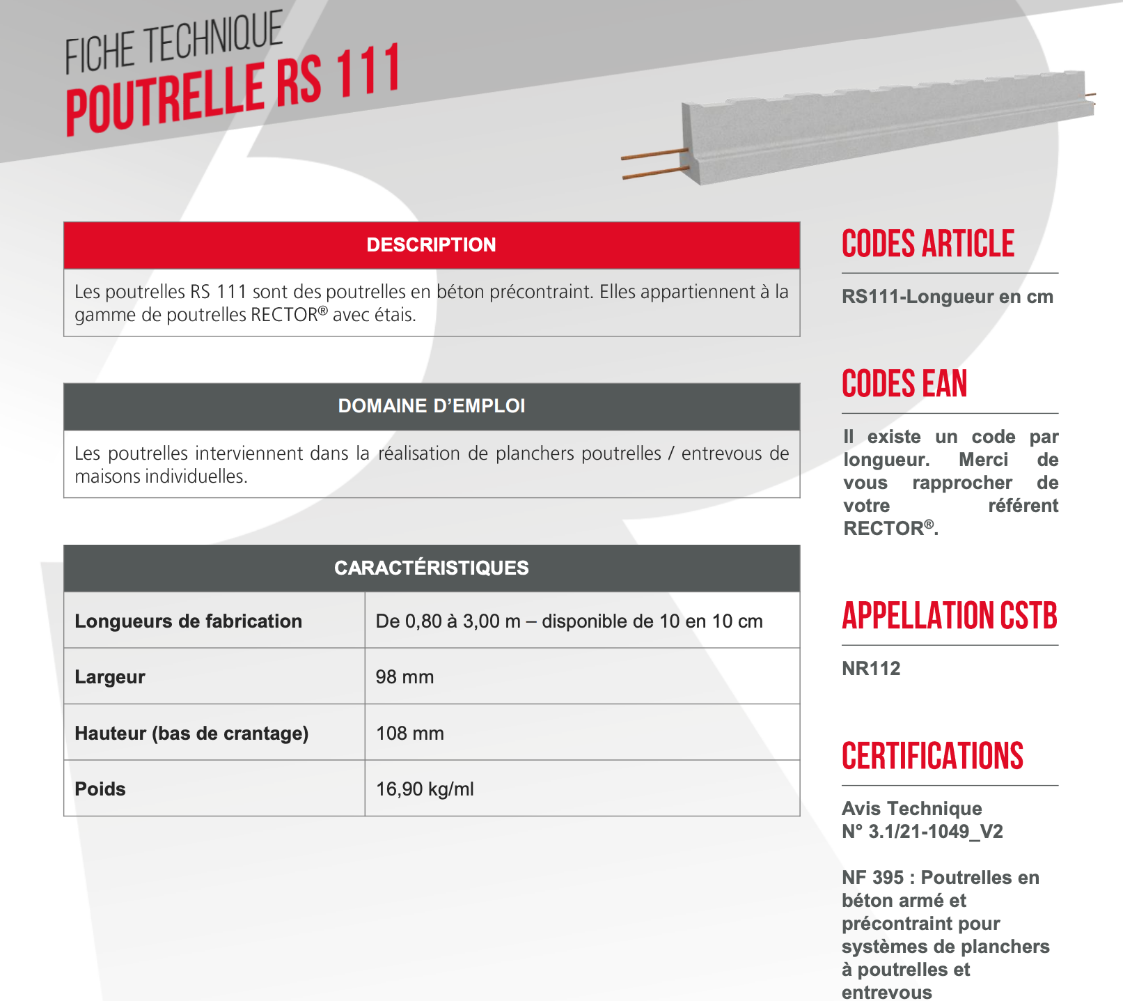 Nos poutrelles RS en béton vous permettent de réaliser des planchers robustes. La qualité des matériaux assure des planchers sécurisés, capables de supporter des pressions importantes. Les poutrelles RS sont utilisées pour réaliser un vide sanitaire, l’aménagement des sous-sols ou d’un plancher haut.