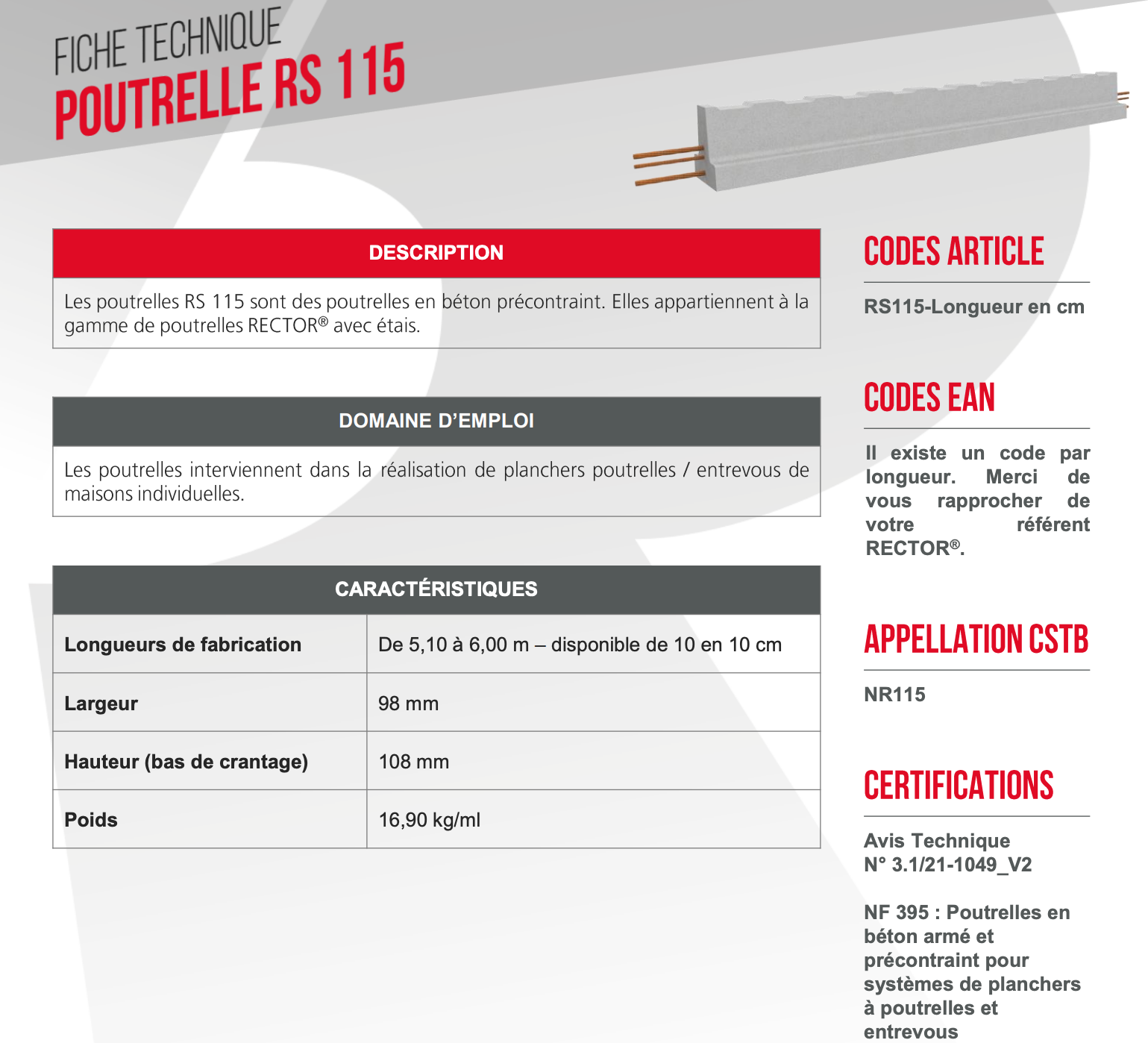 Nos poutrelles RS en béton vous permettent de réaliser des planchers robustes. La qualité des matériaux assure des planchers sécurisés, capables de supporter des pressions importantes. Les poutrelles RS sont utilisées pour réaliser un vide sanitaire, l’aménagement des sous-sols ou d’un plancher haut.